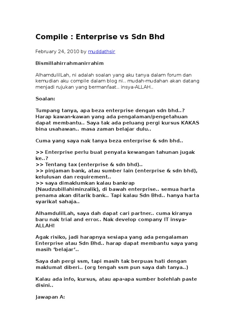 . Sole proprietor or partners resident. To register and incorporate. Pada dasarnya syarikat sdn bhd atau berhad ditubuhkan dengan sejumlah kos yang lebih tinggi dari enterprise.